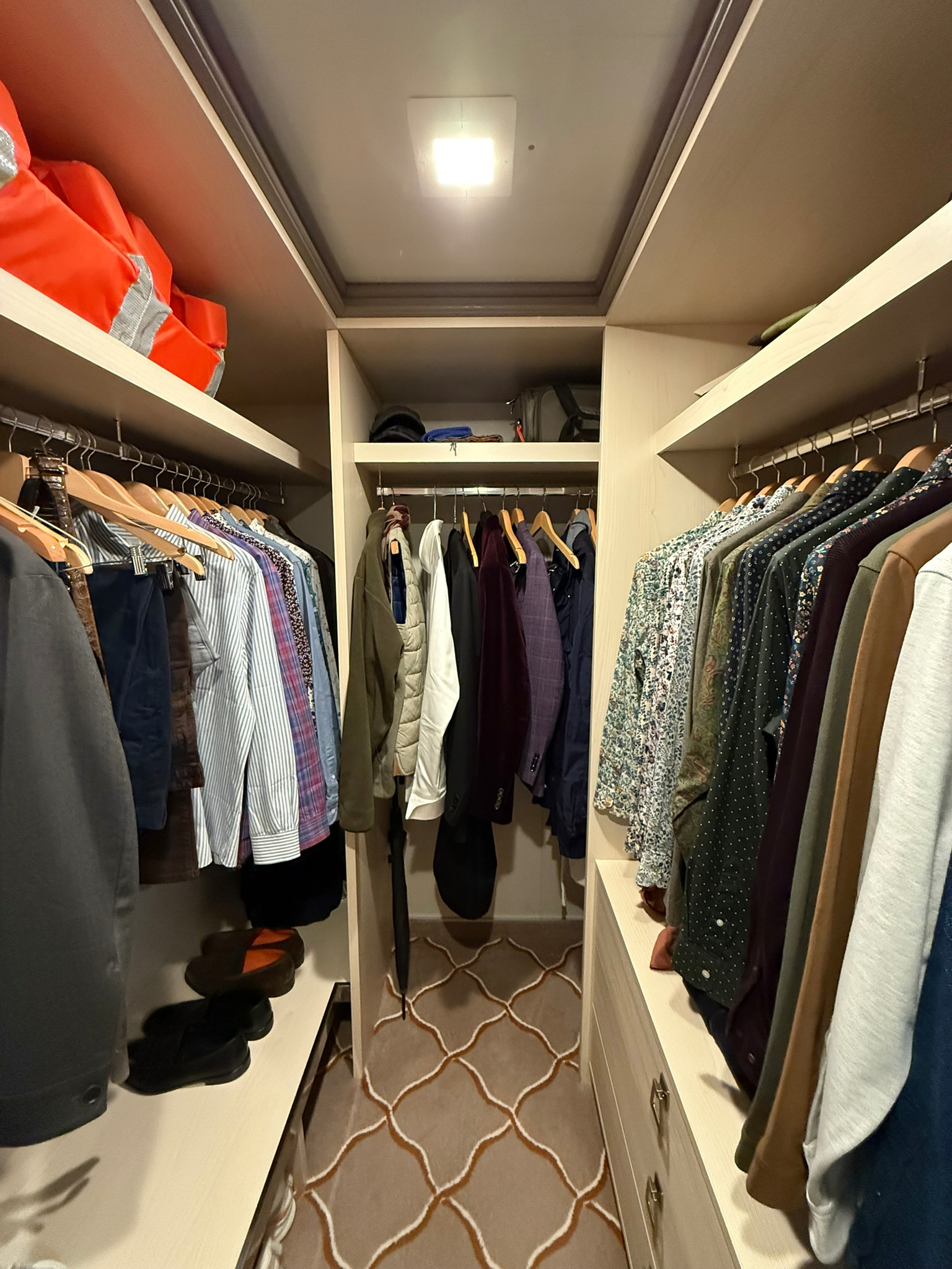 Before sailing, I surprised Charles with an upgrade to a magnificent Silver Suite. This isn’t just a cabin – it’s a true apartment at sea. The Silver Suite features separate sleeping and dining areas, a marble bathroom with large whirlpool and separate shower, and ample walk-in closet space. Having our own private dining table, a full living room setup, and the highly attentive butler service made the suite feel like a cozy, yet elegant, home base for the voyage.