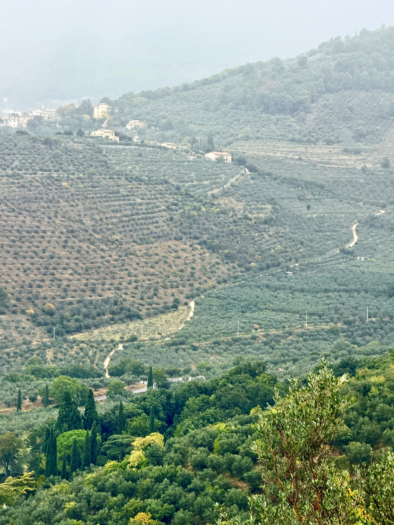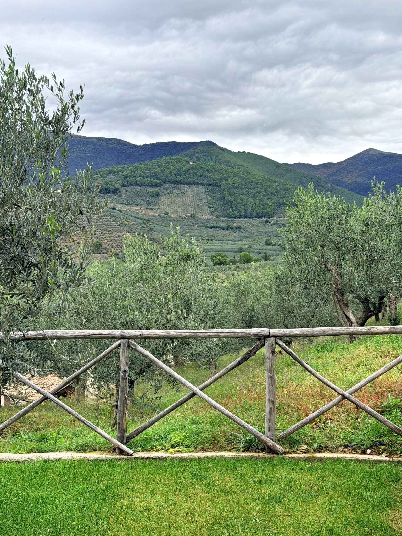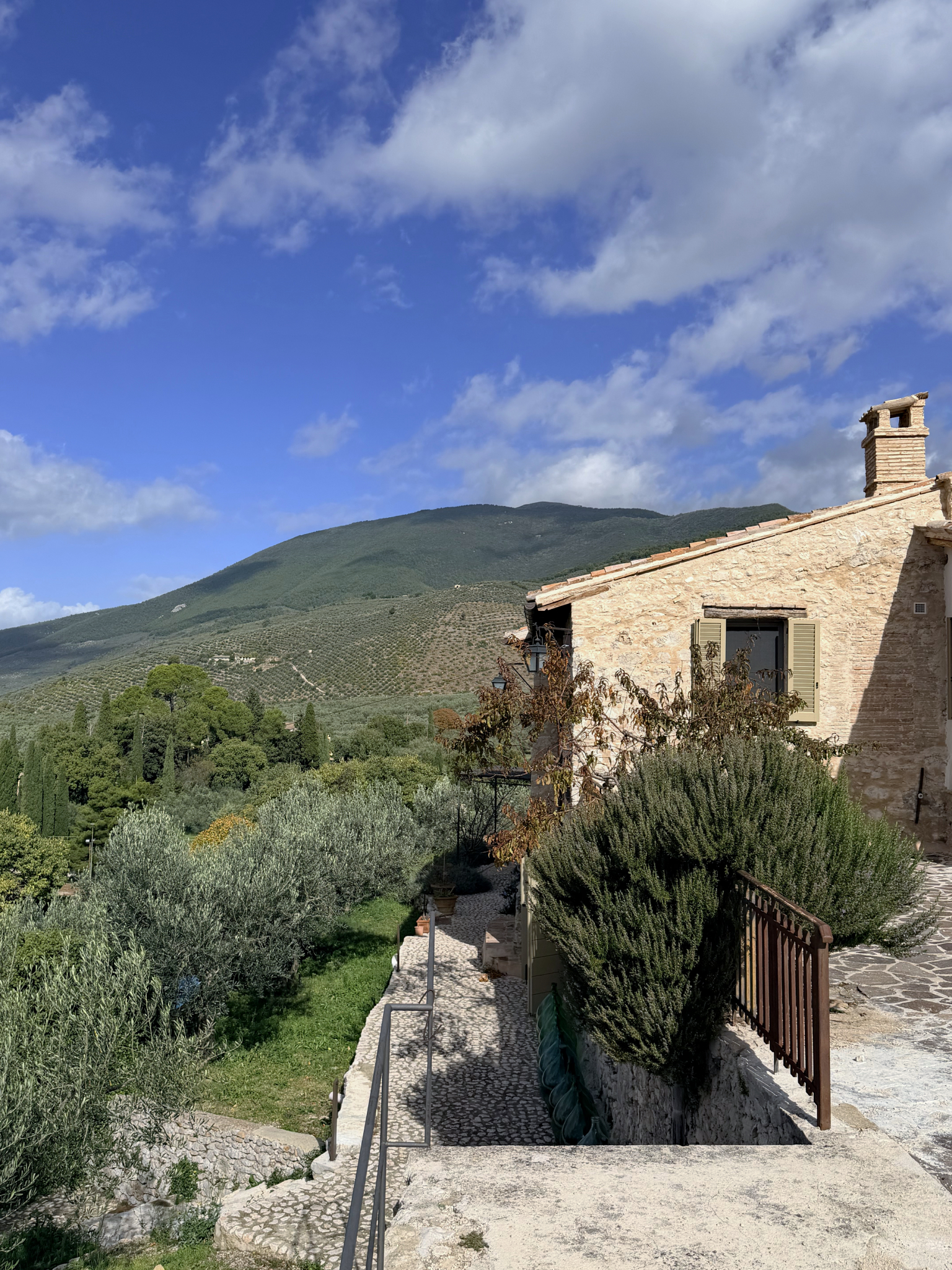 The next morning, I woke up to a verdant paradise. Seeing the property and surroundings in daylight was utterly breathtaking; the house cascades down a hillside surrounded by mature olive groves and terraces with views extending across the Val Umbra.