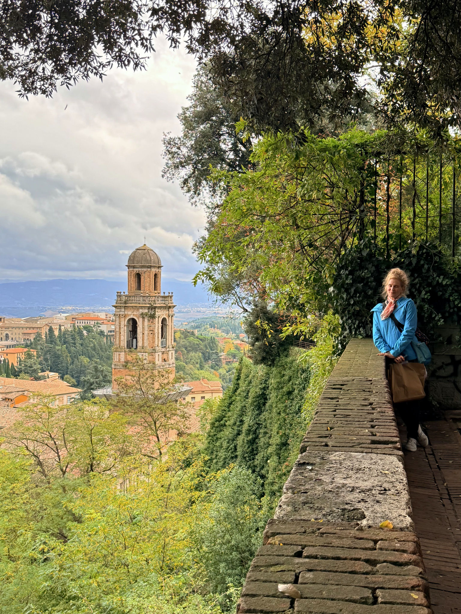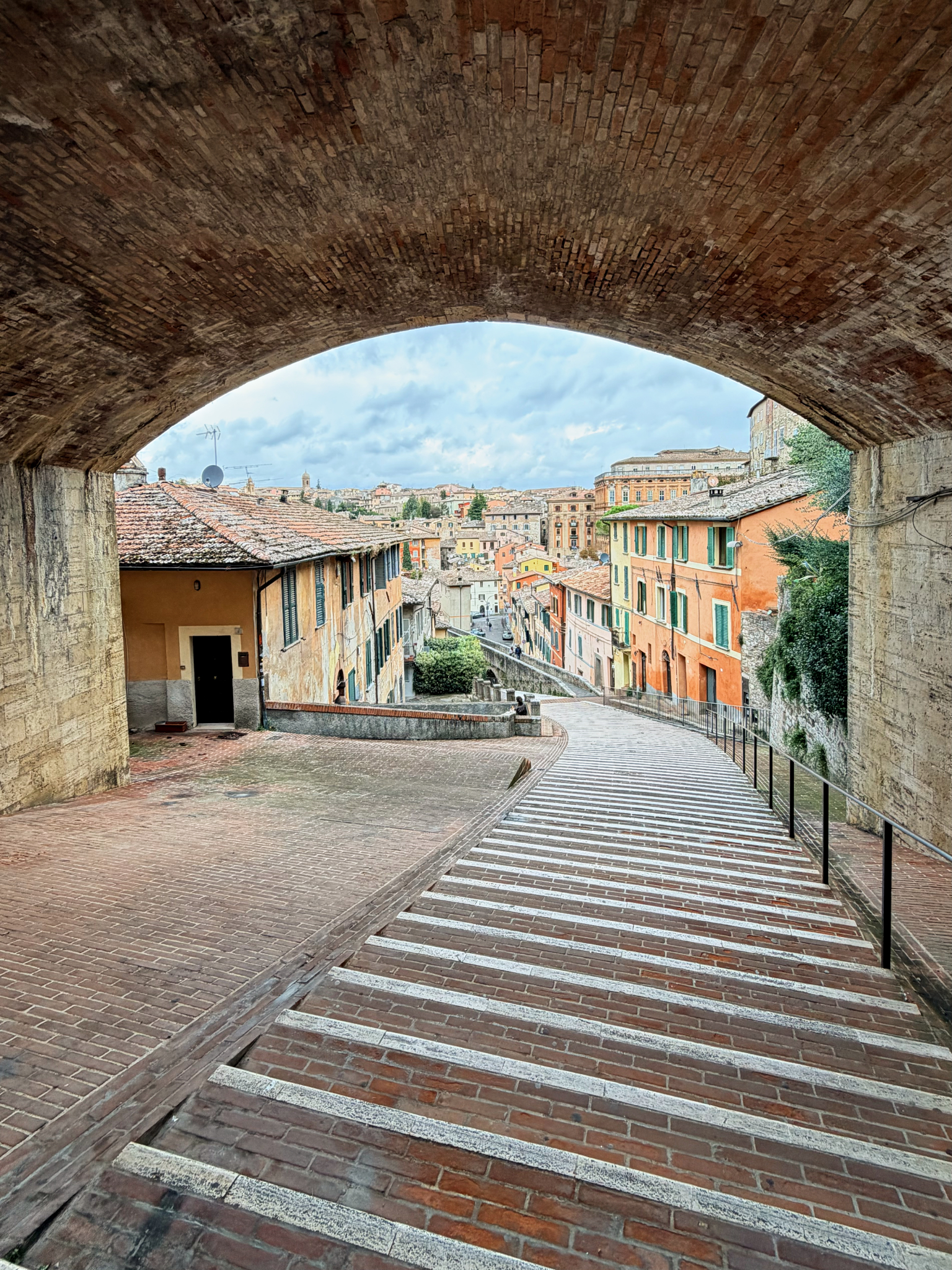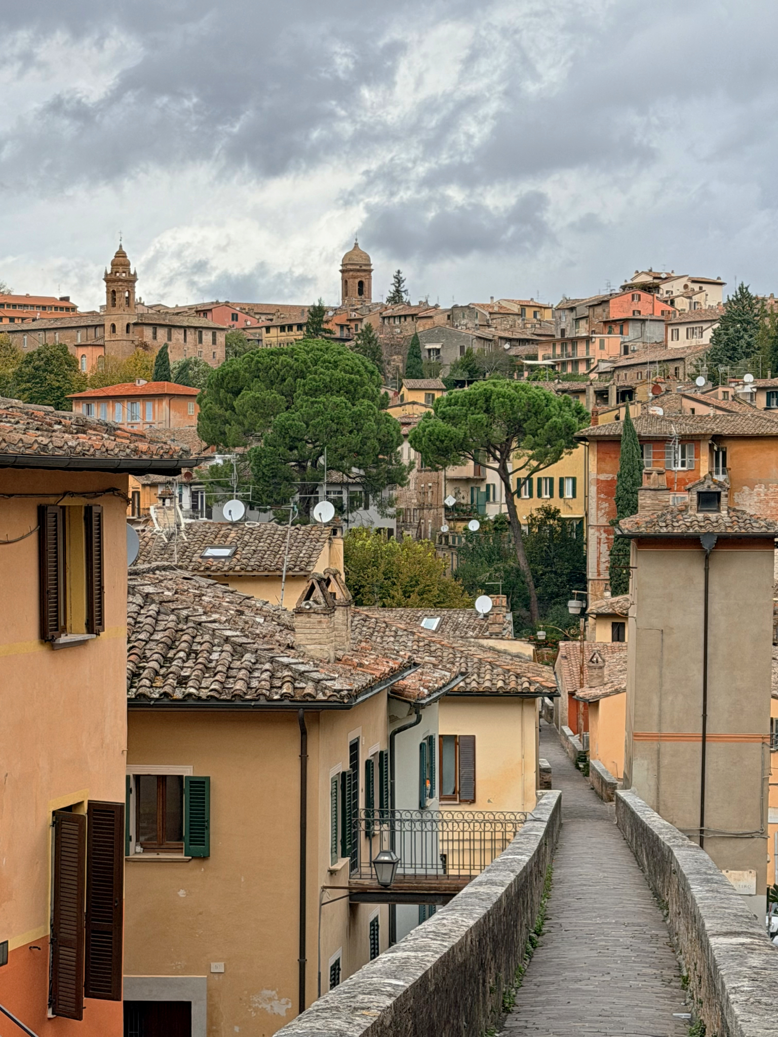 After lunch, we popped into Pasticceria Sandri, a classic Italian cafe dating back to 1860, for some sweet treats like the local Brustengolo, a “poor man’s” biscuit made from corn flour and mixed with raisins, pine nuts, walnuts, and apples. Yum! Perugia is home to some prestigious museums, but wanting to spend our time outdoors, we walked over to see the Scalinata dell’Acquedotto. This “stairway of the aqueduct” is a marvel of medieval engineering; built in the 13th century to bring water from Monte Pacciano to the city’s Fontana Maggiore, the top of the structure was eventually converted into a pedestrian bridge. Today, the narrow walkway flanked by colorful houses makes for a beautiful photo op. We finished our city walk at the Belvedere della Piazza Giovanni Battista Rossi Scotti (that’s a mouthful!), which offers sweeping views of the campanile of Chiesa di Santa Maria Nuova against the rolling hills.
