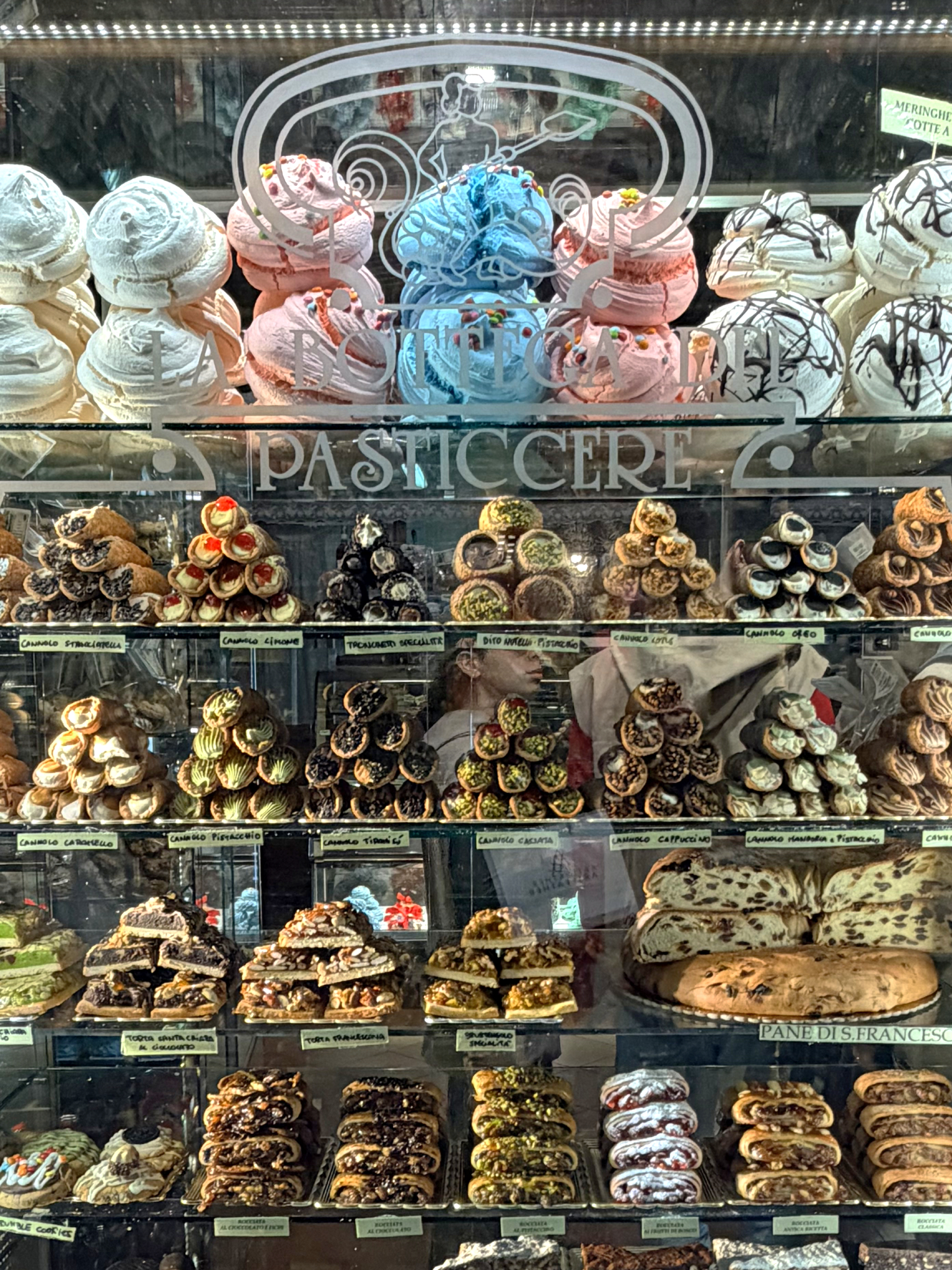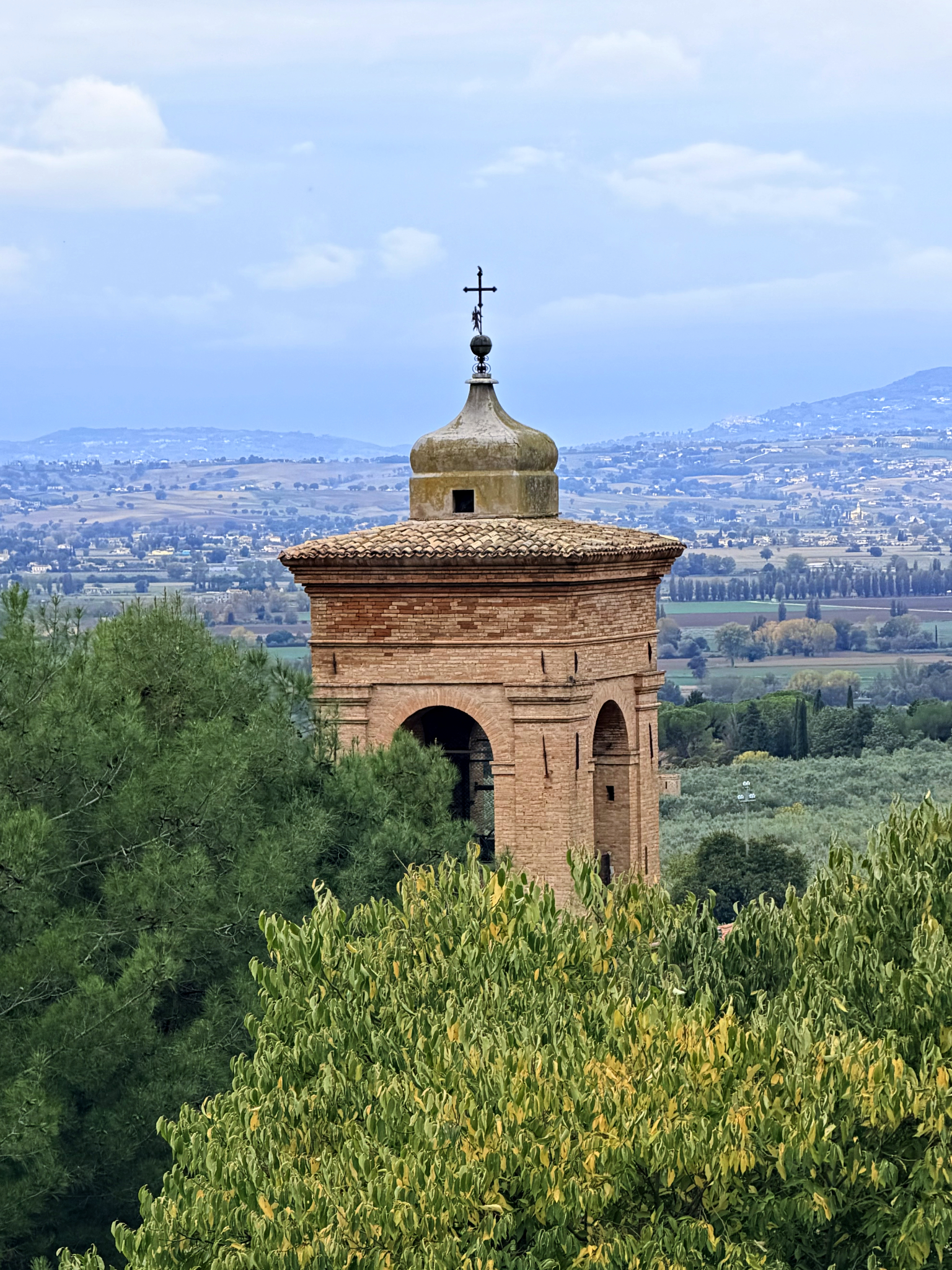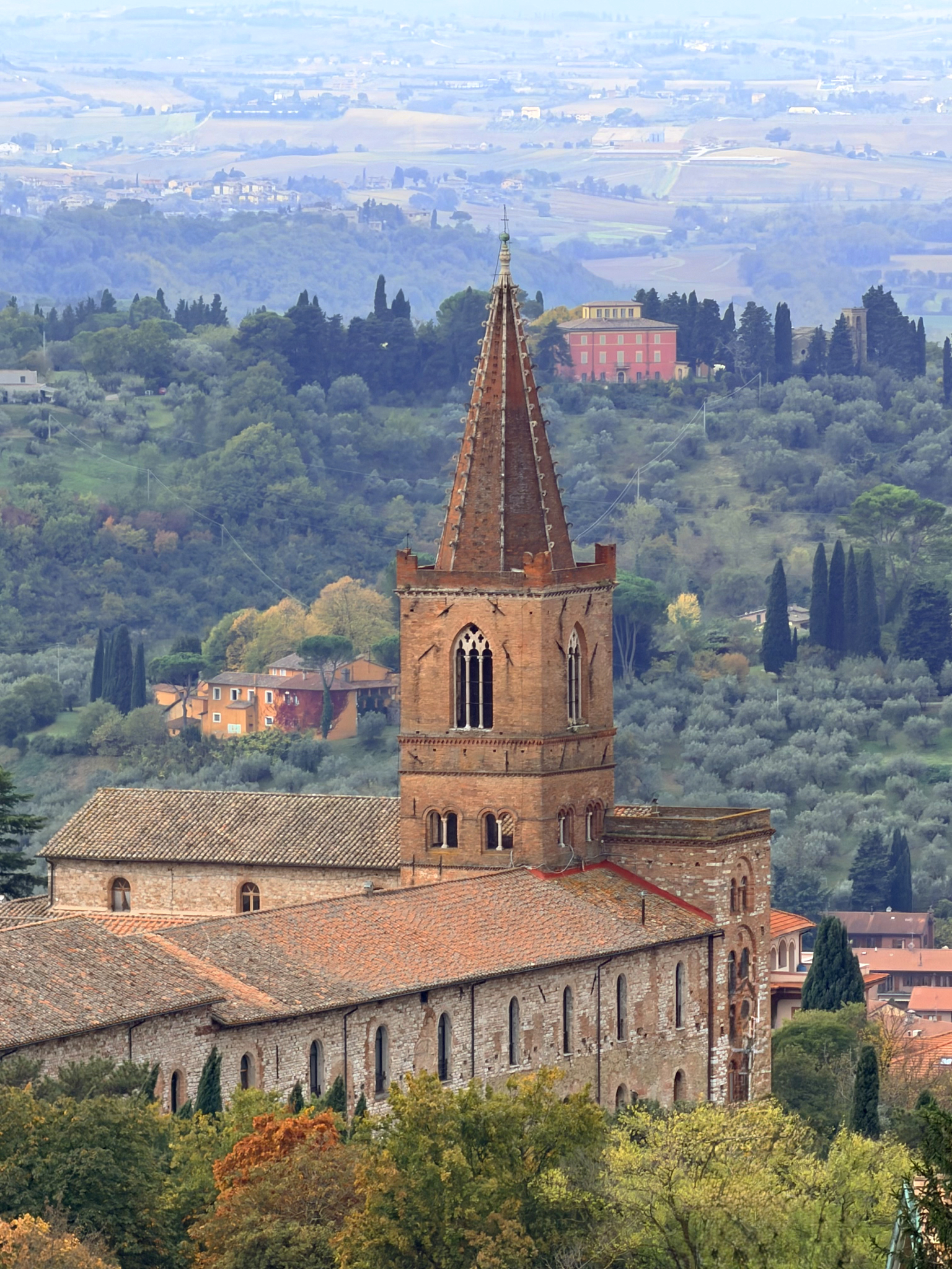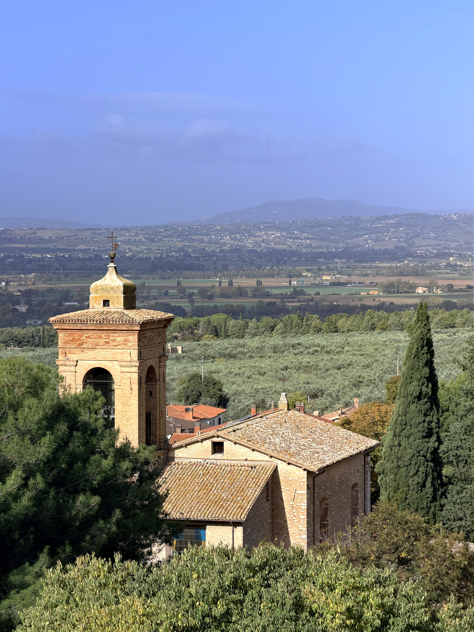 After lunch, we popped into Pasticceria Sandri, a classic Italian cafe dating back to 1860, for some sweet treats like the local Brustengolo, a “poor man’s” biscuit made from corn flour and mixed with raisins, pine nuts, walnuts, and apples. Yum! Perugia is home to some prestigious museums, but wanting to spend our time outdoors, we walked over to see the Scalinata dell’Acquedotto. This “stairway of the aqueduct” is a marvel of medieval engineering; built in the 13th century to bring water from Monte Pacciano to the city’s Fontana Maggiore, the top of the structure was eventually converted into a pedestrian bridge. Today, the narrow walkway flanked by colorful houses makes for a beautiful photo op. We finished our city walk at the Belvedere della Piazza Giovanni Battista Rossi Scotti (that’s a mouthful!), which offers sweeping views of the campanile of Chiesa di Santa Maria Nuova against the rolling hills.