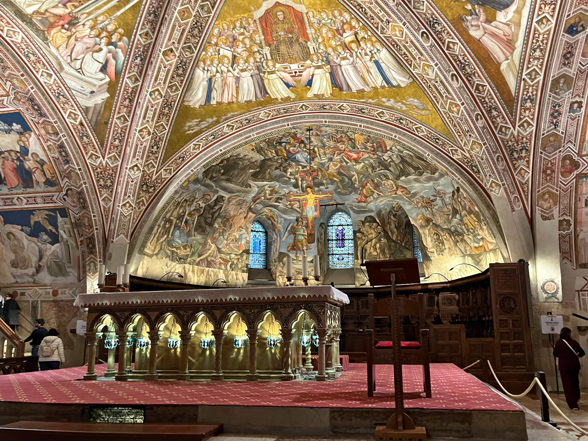 We ended the day in Assisi for a tour of the famous Basilica Superiore di San Francesco d’Assisi. Though our guide had to cancel due to a medical emergency, the timing of our arrival was perfect. We pulled up to the town in a windstorm just as the hoards of tour buses were departing.