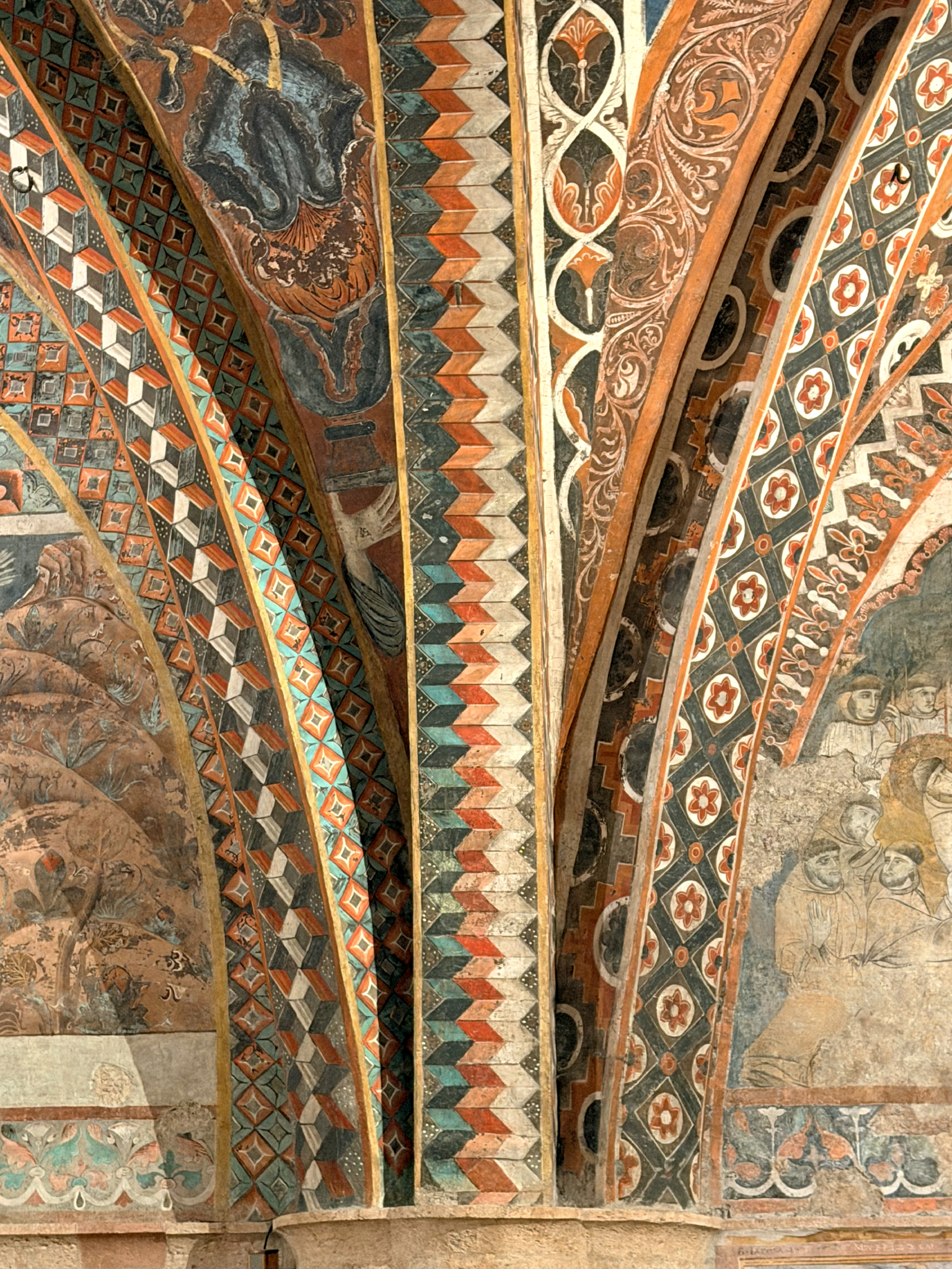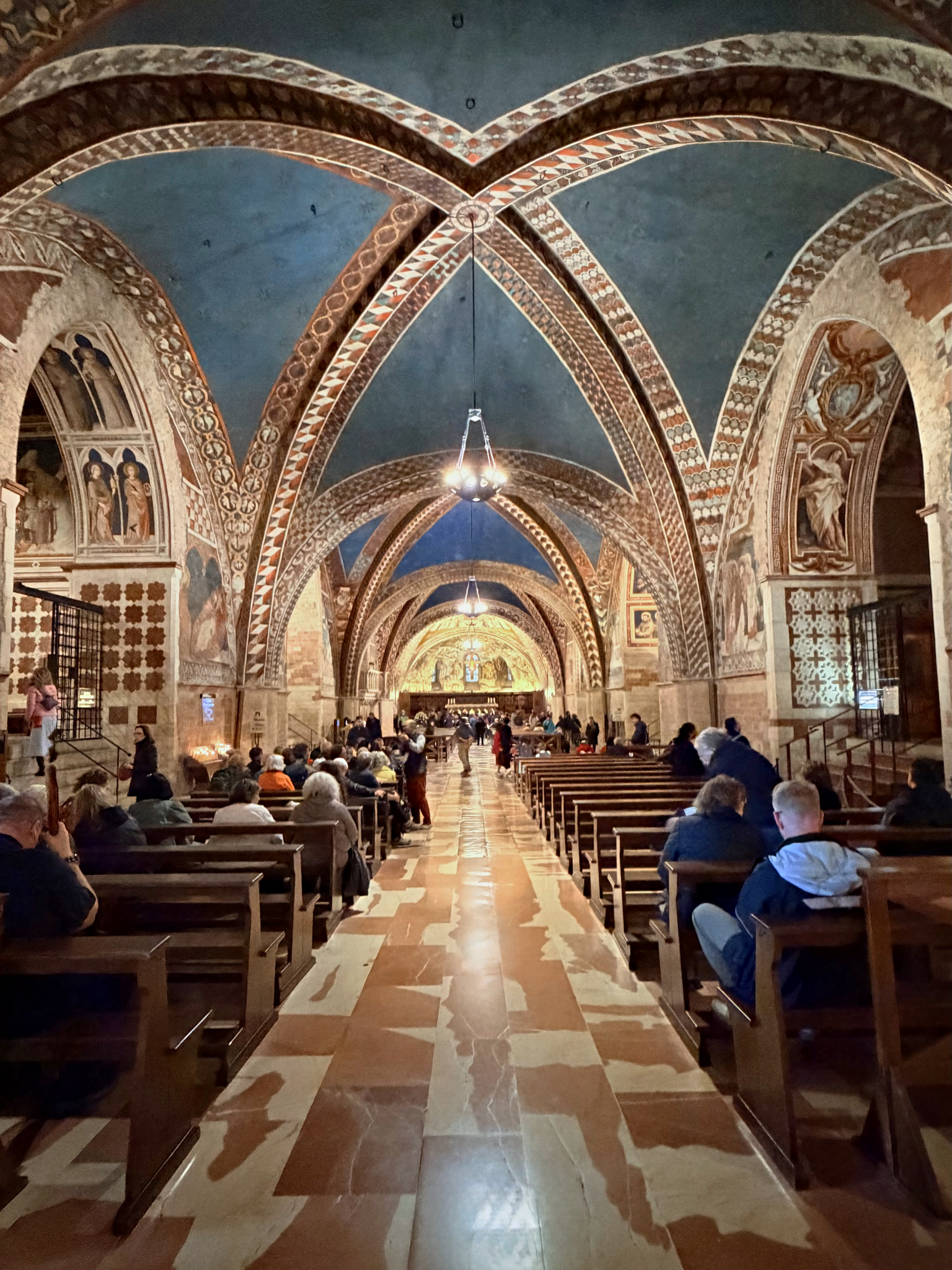 As we stood in the Piazza Inferiore di San Francesco, a massive gust of wind scattered the remaining tourists, leaving the square empty for a perfect photo op showcasing the horizontal brickwork leading to the cathedral. Inside, I was blown away by the detailed frescos, colors, and patterns covering every square inch of the interior. The Upper Basilica is home to the legendary fresco cycle attributed to Giotto, depicting 28 scenes from the life of Saint Francis. These works revolutionized Western art by introducing emotional realism and three-dimensional space. To see the vibrant lapis lazuli blues and intricate patterns in the rib vaulting—much of which was painstakingly restored after the 1997 earthquake—was truly moving.