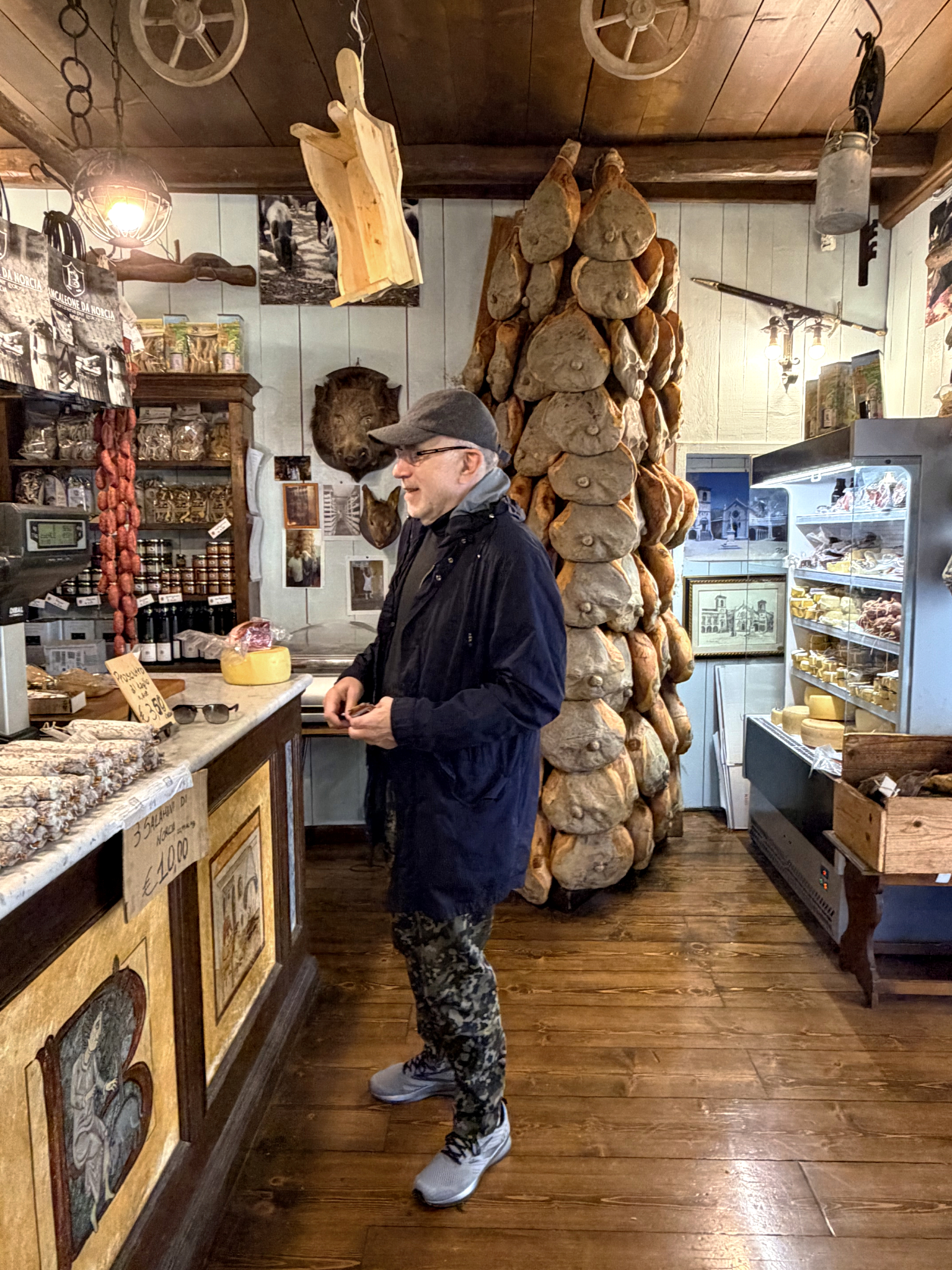 Lunch at Locanda del Teatro was a celebration of truffle season. We shared a massive plate of pappardelle with sausage, porcini, and black summer truffles, along with a truffle frittata and a bowl of the famous local lentils of Castelluccio. Afterward, we shopped at Brancaleone da Norcia, a historic norcineria, where we bought vacuum-packed salsiccia stagionata and pancetta to take back home. The pancetta is a gift that keeps on giving; I’ve used it in many soups and still have a small hunk in my freezer.