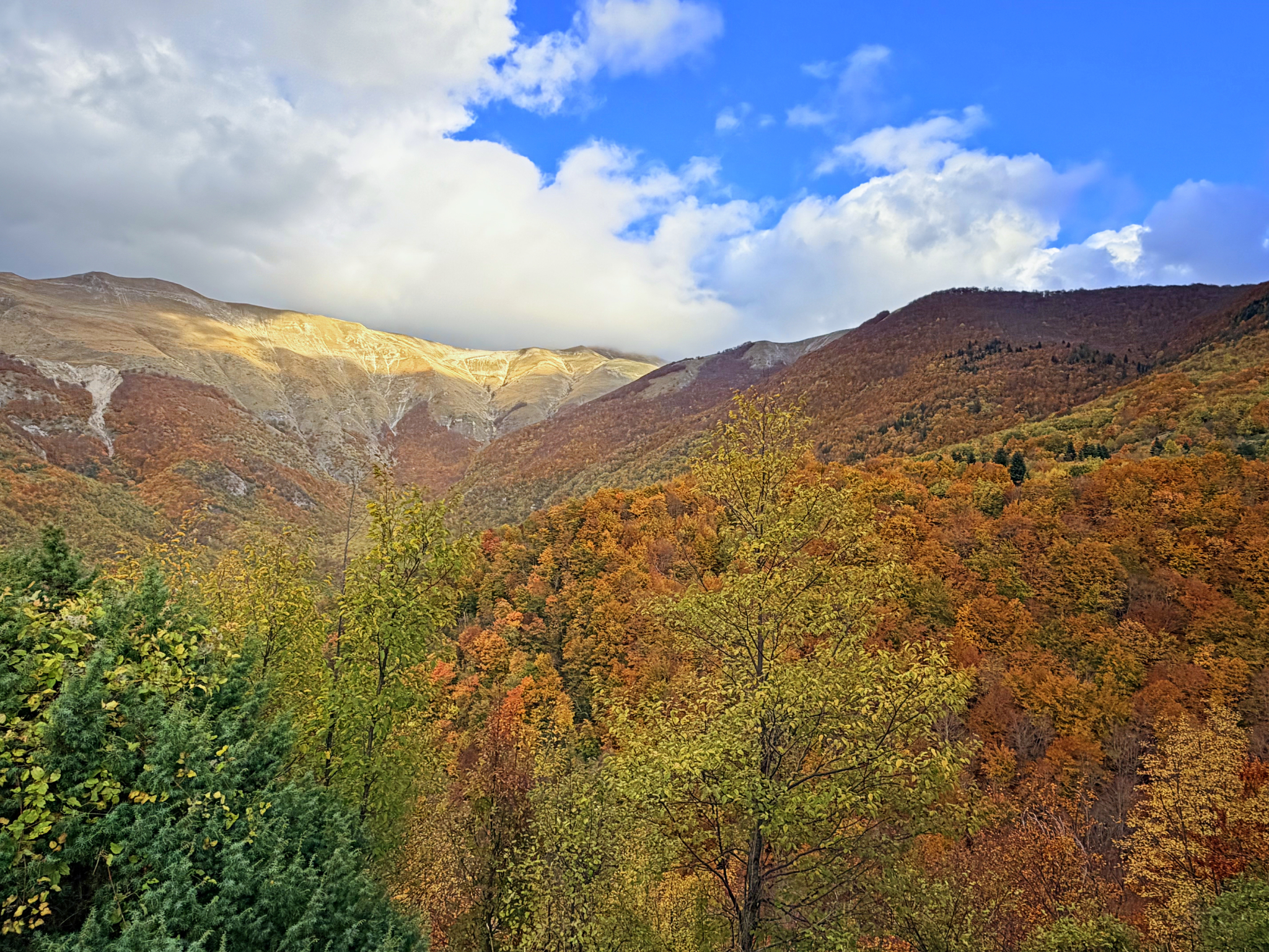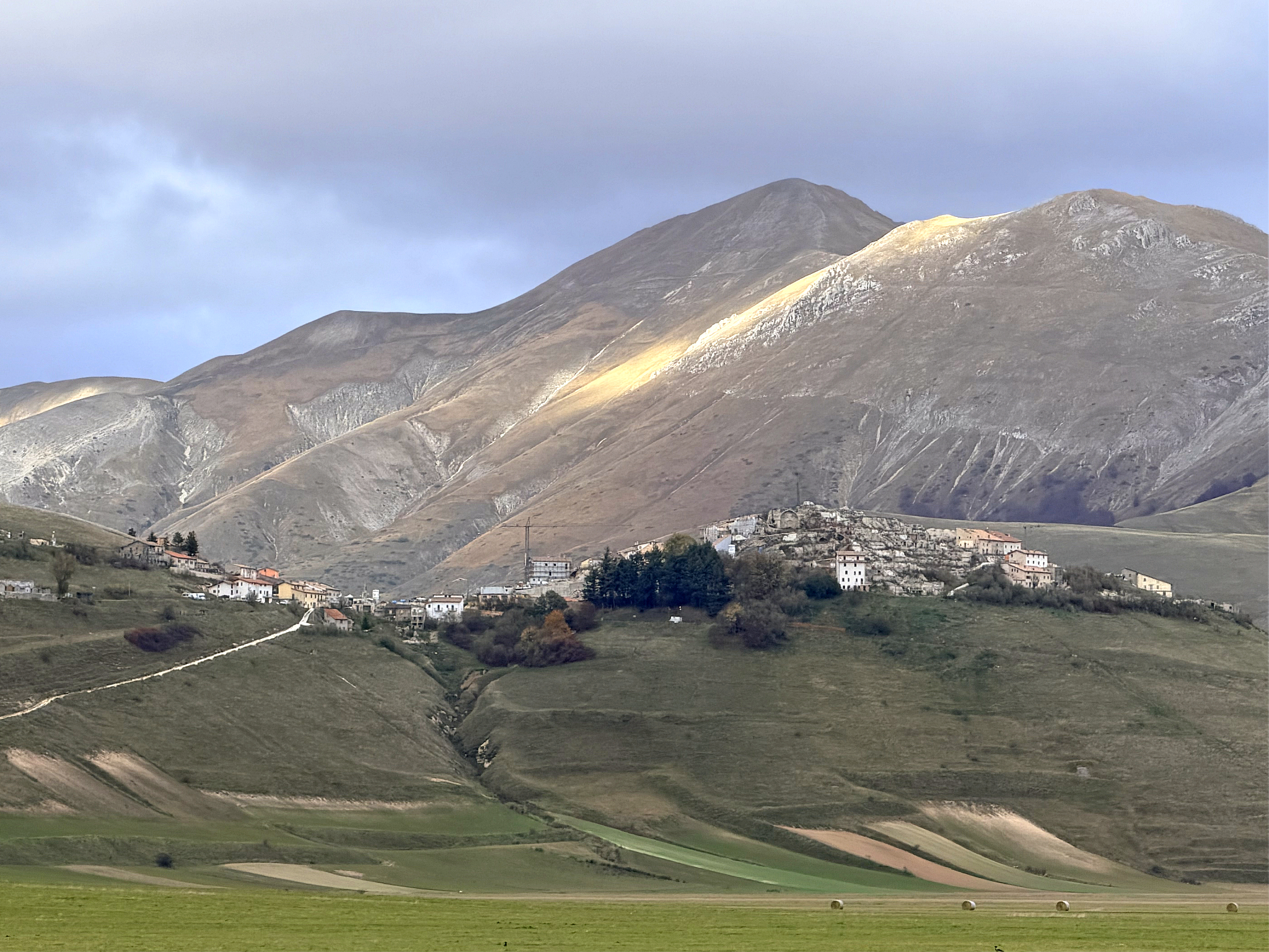 We descended into the valley, stopping at Sibillini Ranch to visit with some horses, before heading to Castelluccio di Norcia. The old town was decimated by the quake, so residents have set up temporary shops along the road. At Norcineria Castelluccio, we ducked in for warm beverages and famous biscotti made with lentil flour. The owner shared that he didn’t expect the town to be fully rebuilt for another 20 years, but he was thrilled to meet genuine New Yorkers. In a comical moment, Tricia and Richie broke out into a tap number to “New York, New York” for him and fellow patrons. We returned to Poreta via a circuitous route through the autumnal foliage of Castelsantangelo sul Nera and Visso, which are also still slowly rebuilding.