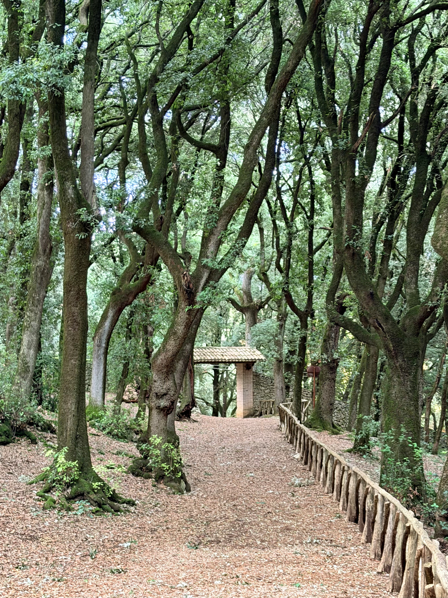 Later, we drove to the Bosco Sacro di Monteluco, an ancient “Sacred Forest” perched 800 meters above Spoleto. A site of spiritual retreat since the 5th century, the forest is a botanical rarity composed almost entirely of dark holm oaks. Unlike surrounding deciduous woods, these evergreens create a perpetual twilight that was a favorite retreat of Saint Francis. As we walked, the breeze swayed the intertwining branches high above us, adding an unmistakable sense of mystique to the air.