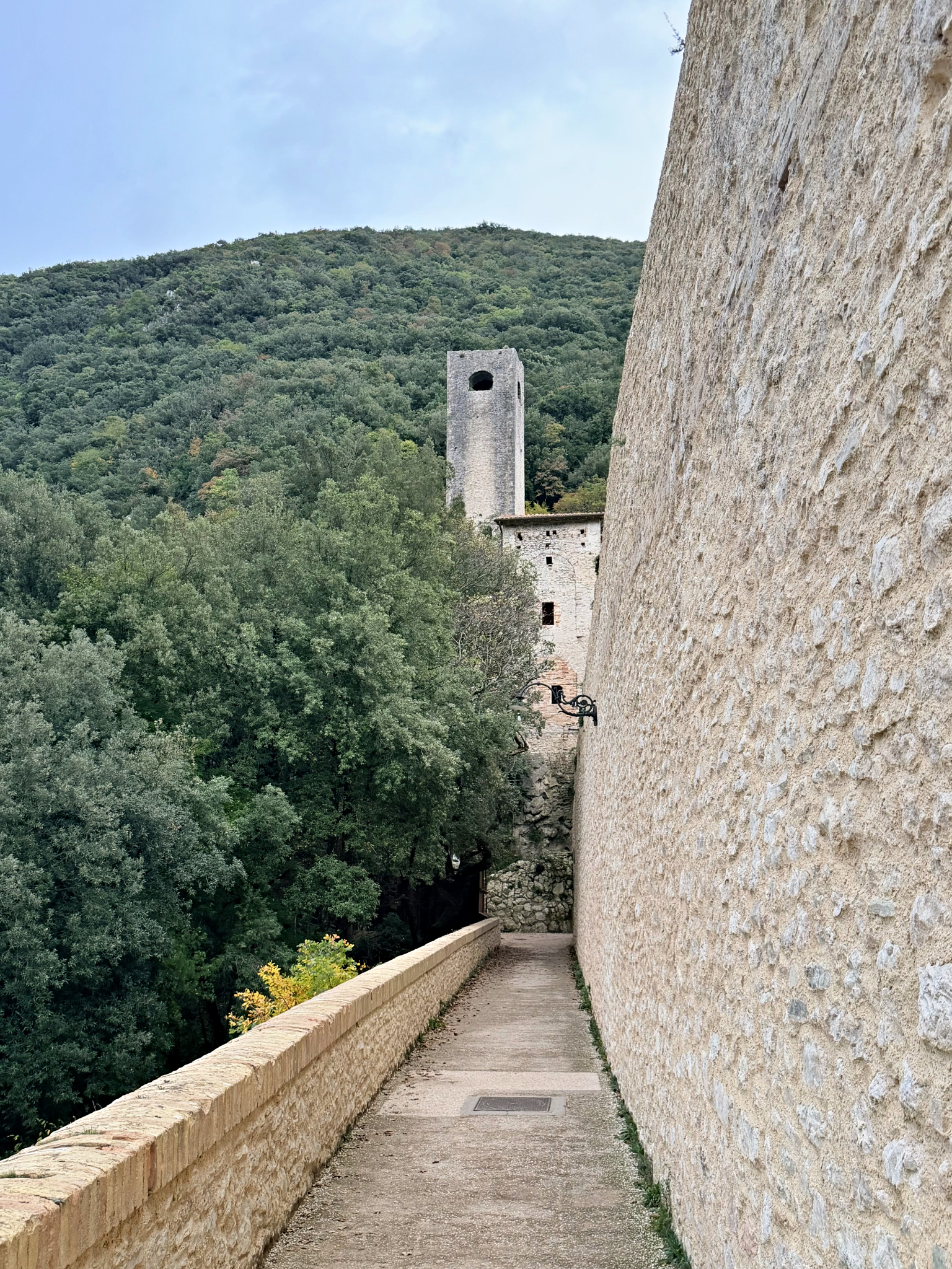 On the descent, we stopped at the Ponte delle Torri, a striking 13th-century bridge spanning a deep ravine. Standing nearly 80 meters high and stretching 230 meters across, this massive limestone structure served as both a bridge and an aqueduct. Its ten majestic arches once connected the city of Spoleto to the slopes of Monteluco. Walking across it provided a dizzying, spectacular perspective of the valley below.