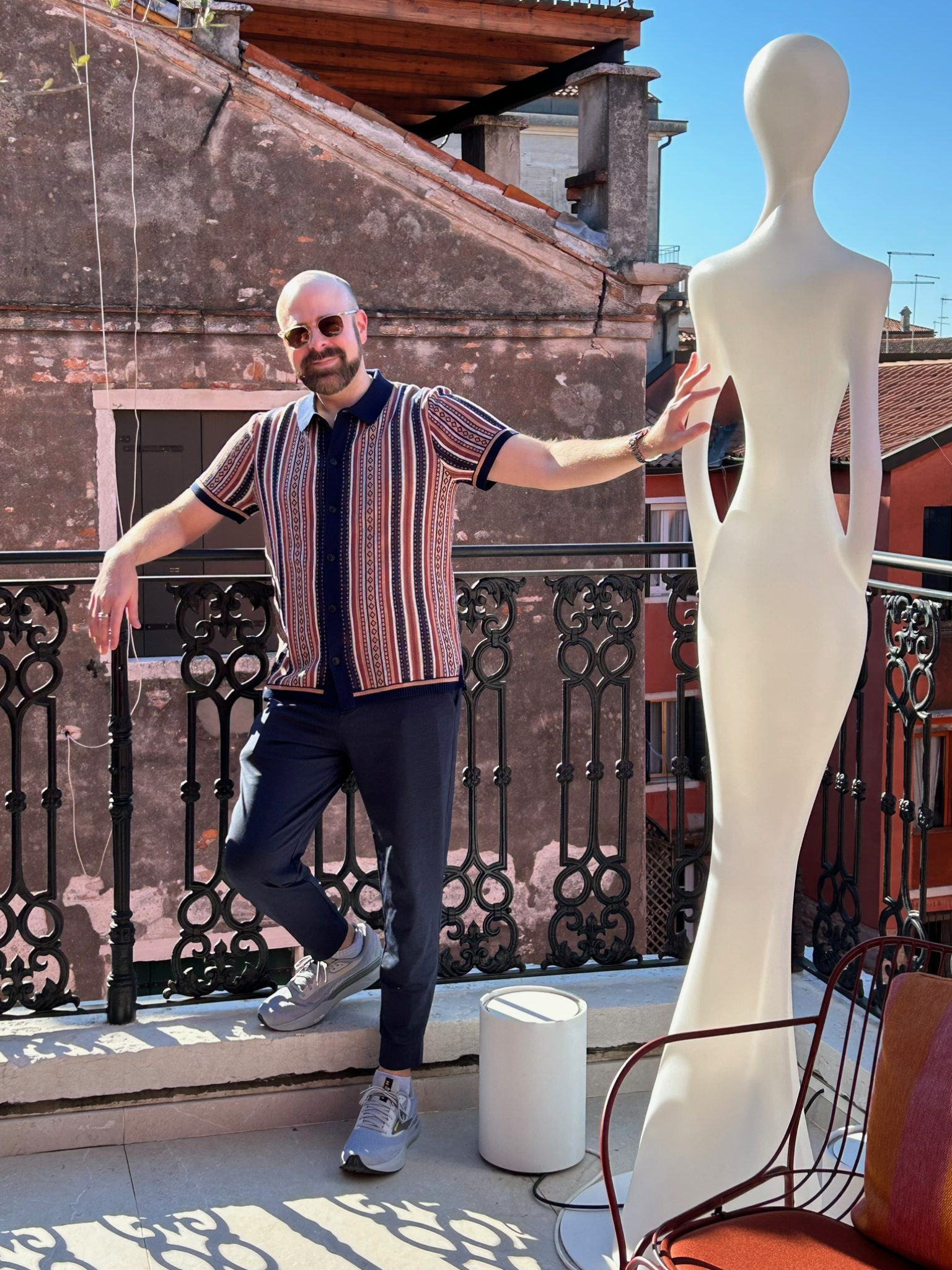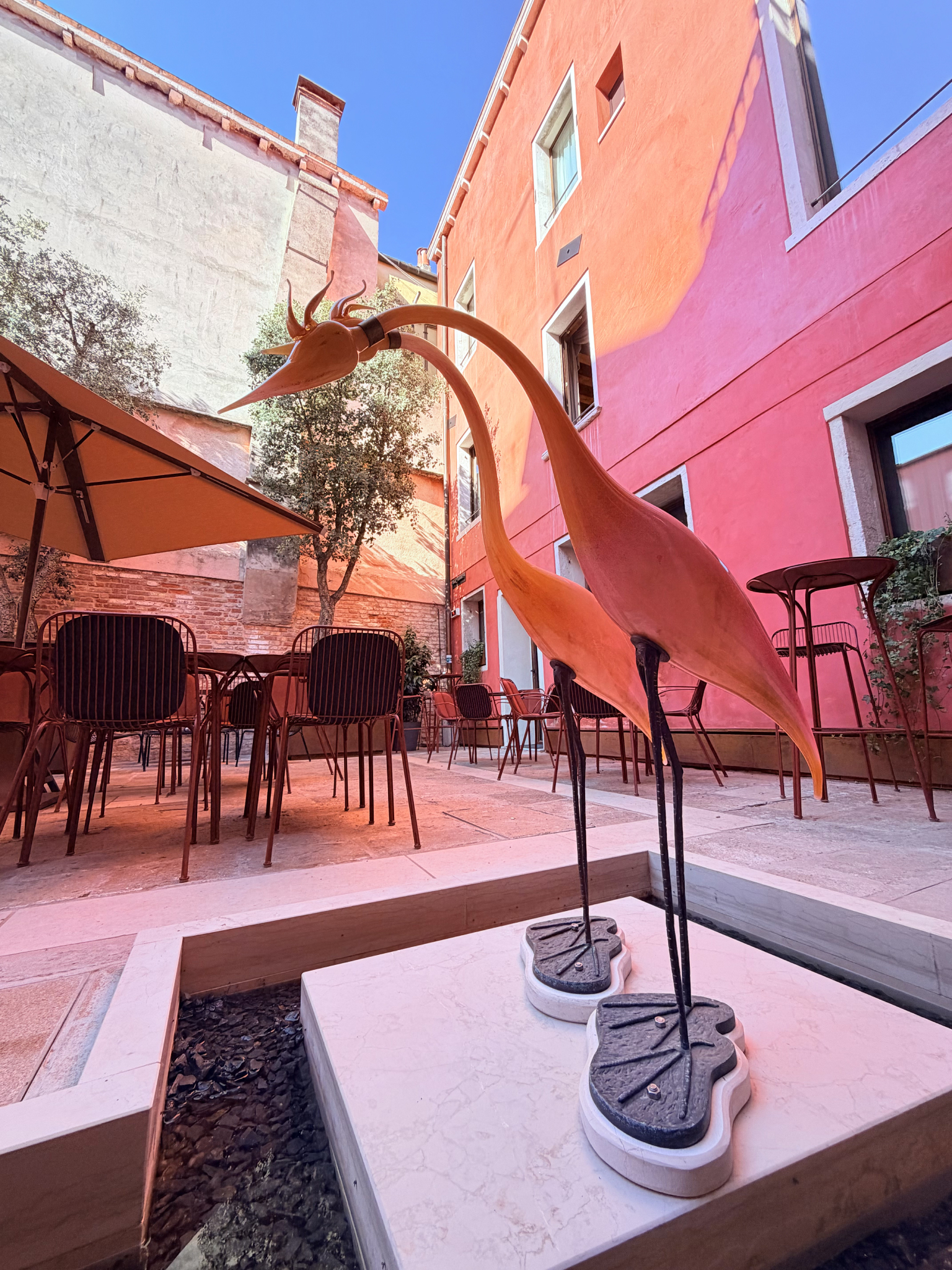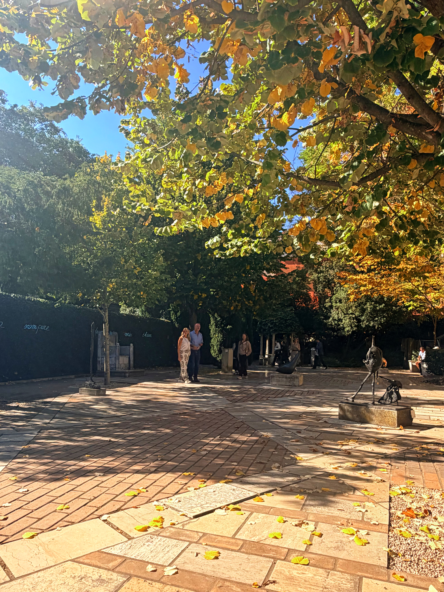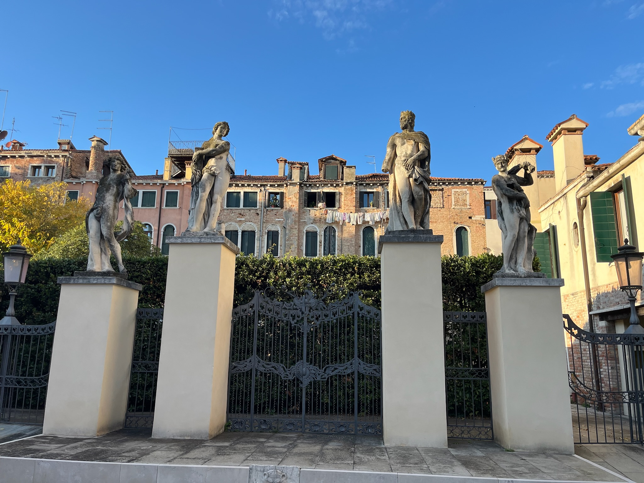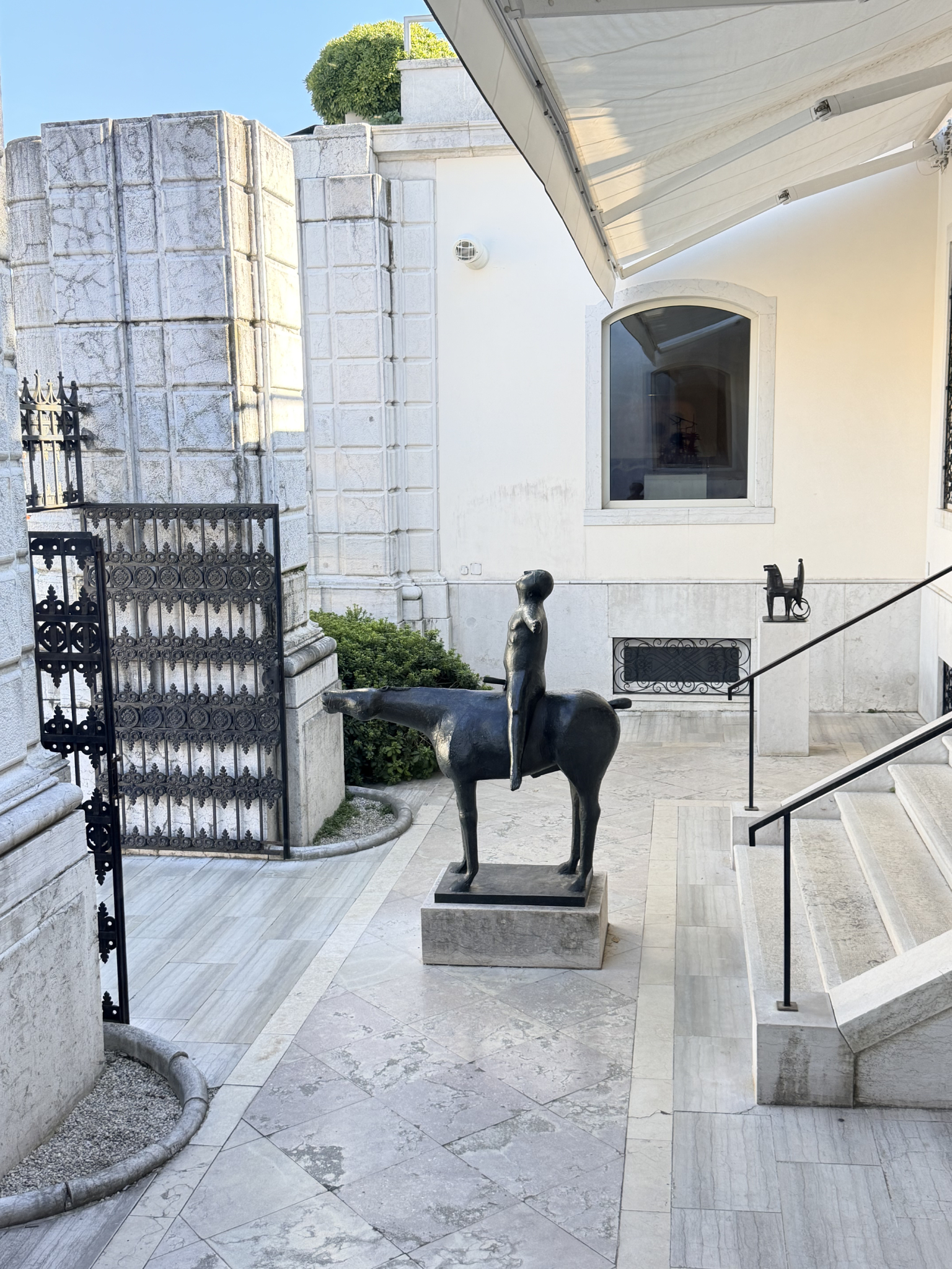 Eventually, we drifted toward the waterfront terrace, which offers one of the most unobstructed views of the Grand Canal. There, we had a laugh taking photos with Marino Marini’s The Angel of the City—the famous bronze man on a horse who greets passing gondolas with his notoriously detachable phallus. Before making our exit, we wandered into the serene sculpture gardens to pay our respects at the final resting place of Peggy herself, alongside her 14 beloved Lhasa Apsos. In the crisp mid-October air, the Osmanthus and Sasanqua Camellias were in full, glorious bloom, perfuming the garden with a delicate, sweet fragrance that seemed to hang perfectly in the still morning air. It was a transcendent visit that left us all feeling invigorated for the day ahead.