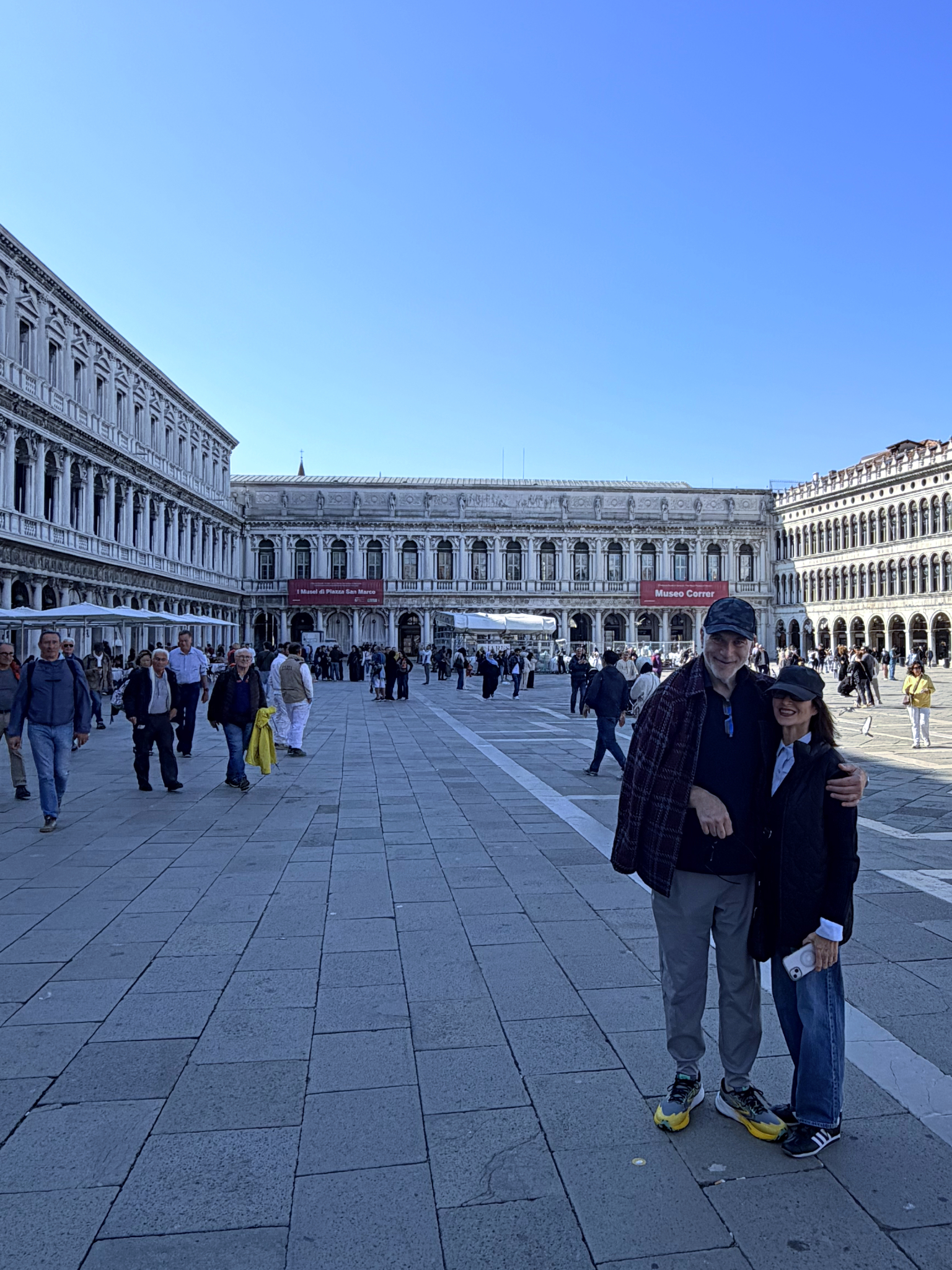 Knowing that Piazza San Marco would be a “zoo,” we decided to tackle the tourist epicenter on our first day. We crossed the Grand Canal via the wooden Ponte dell’Accademia, pausing to ogle the iconic view of the milky green waters framed by the Basilica di Santa Maria della Salute in the distance.