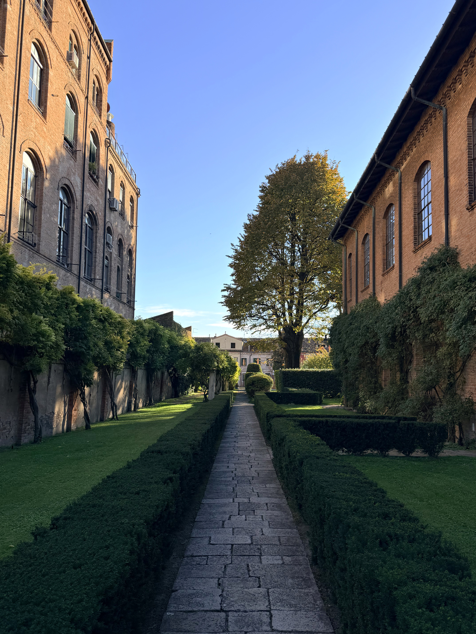 After lunch, we hopped a vaporetto to Giudecca, an island that remains a sanctuary for those looking to escape the relentless hum of the tourist track. Our first destination was the legendary Fortuny showroom and factory. Founded by the visionary polymath Mariano Fortuny, the atelier continues to produce its world-renowned hand-printed fabrics using the same secretive, artisanal methods established over a century ago. The true highlight, however, was being treated to a private tour of the lush, storied gardens hidden behind the factory walls—a verdant oasis of ancient trees and climbing vines that felt a world away from the stone and water of the city.