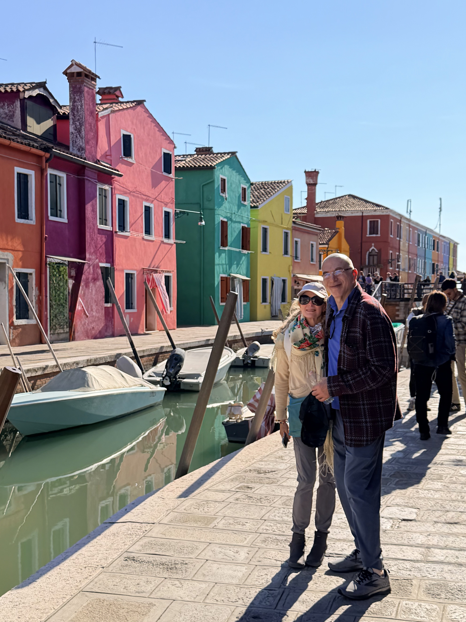 A quick water taxi ride brought us to Murano, the historic heart of the world’s glass production since 1291. Charles and I had been eyeing the beautiful glassware at our hotel and throughout our meals, and we were determined to bring a piece of it home. We stumbled upon the Franco Schiavon Gallery, an immense space filled with breathtaking artistry. After much deliberation, we settled on eight stunning tumblers—a colorful array of hand-blown glass, each one unique and reflecting the light of the lagoon. Further up the canal, Karen, Tricia, and I picked up a selection of glass beads, which we planned to thread into jewelry once we reached Umbria a few days ahead.