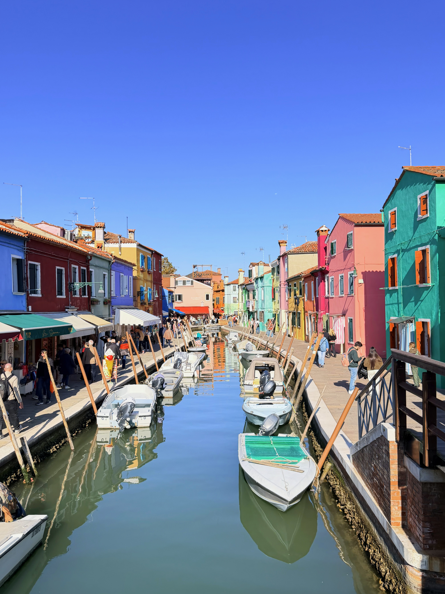 After lunch, we crossed the Ponte Longo wooden bridge into Burano and were immediately enamored with the stunning colors. It was Sunday, and the island was packed with locals enjoying their day off, but we managed to find quieter, tucked-away lanes. We had a blast with our photography, posing against vibrant backdrops of purple, pink, blue, orange, and green that seemed almost too bright to be real.